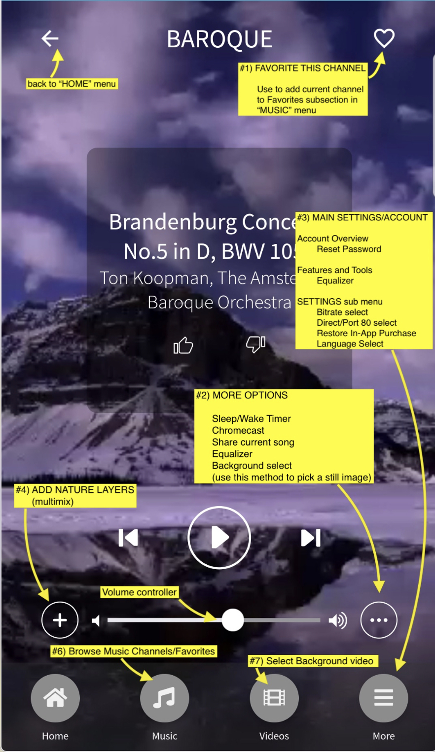 - L'application démarre sur l'écran ACCUEIL, où vous pouvez sélectionner un canal pour la lecture ou voir vos canaux favoris (ou vous pouvez aller dans le menu MUSIQUE pour plus d'options de chaînes).